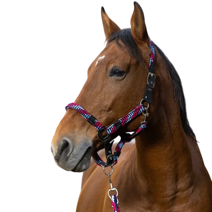 EQUITHEME - Ensemble Licol tressé et Longe fuchsia/ bleu ciel/ marine (avec plaque gravée en option)